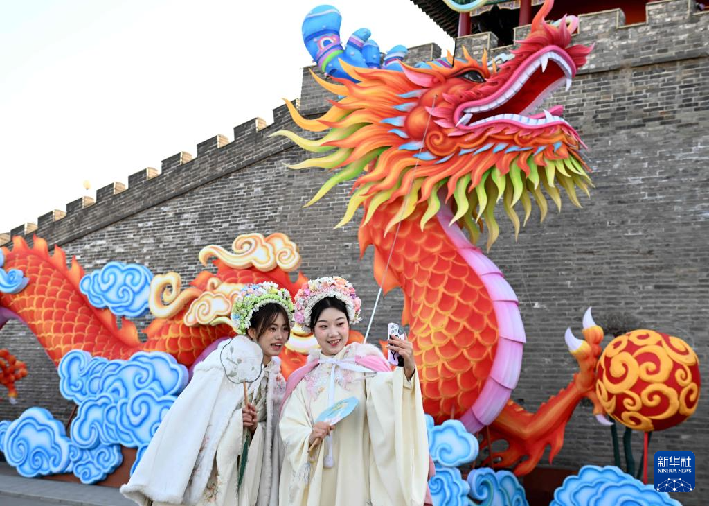 1月24日,游客在河北省石家庄市正定古城南城门花灯前拍照。