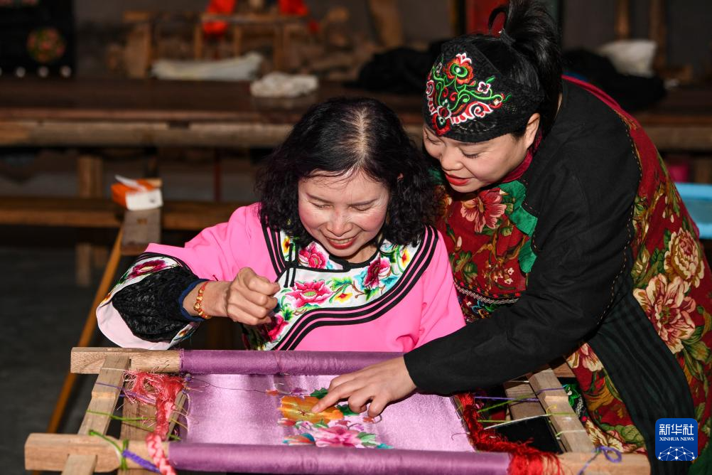 1月23日,在秀山县梅江镇民族村,杨秀燕(右)和绣娘交流刺绣技巧。