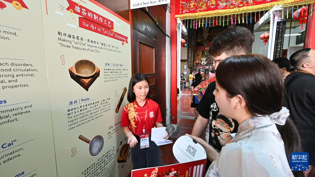 2月18日,在马来西亚槟城庙会,当地学生为游客讲解客家擂茶习俗。