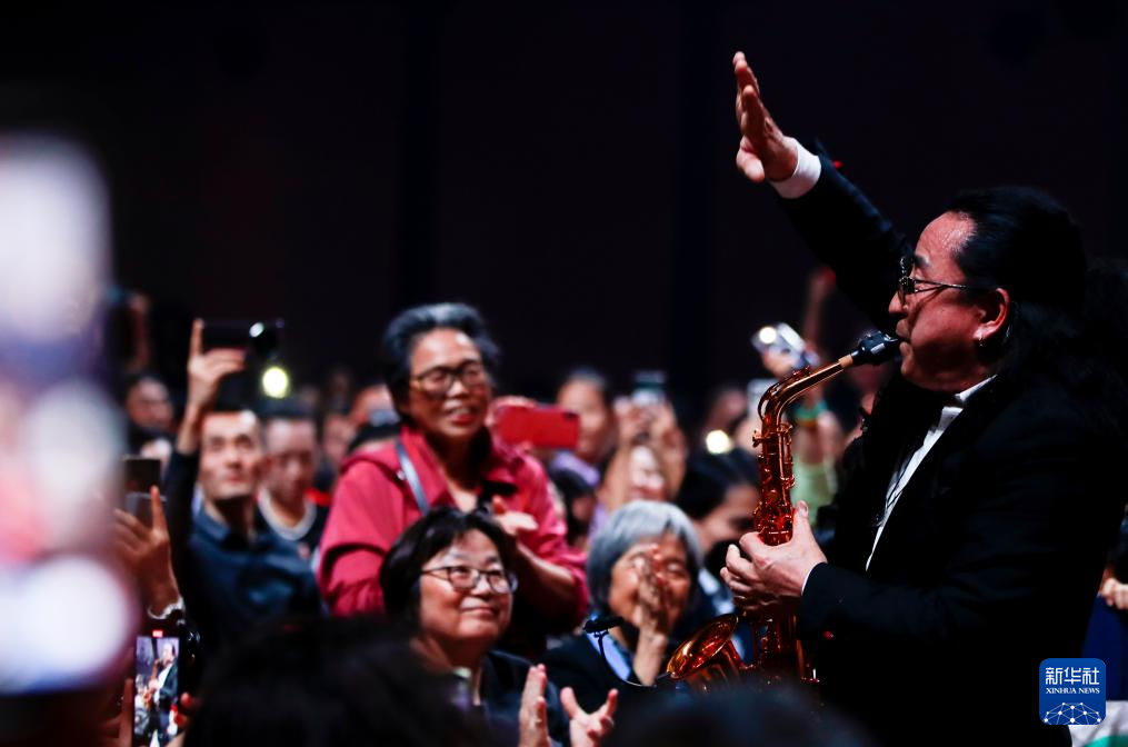 2月21日,萨克斯演奏者刘家军在澳大利亚悉尼“四海同春”访演活动上与现场观众互动。
