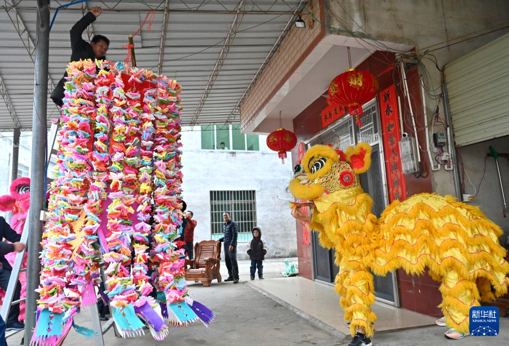 2月22日,广西柳州市柳江区进德镇举行“上花灯”系列民俗闹元宵活动。这是村民舞狮迎花灯。