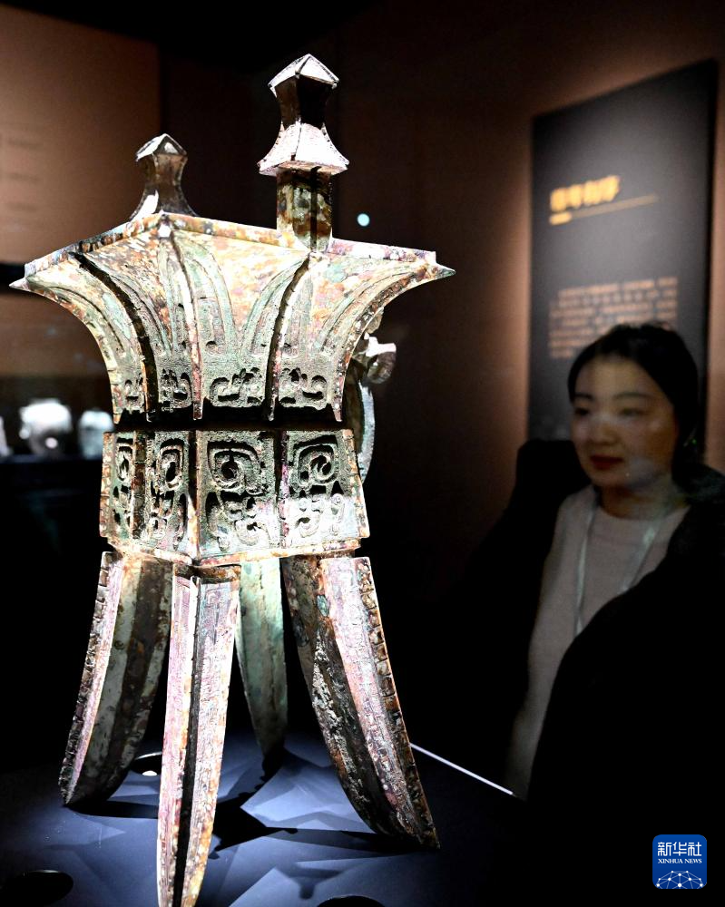 2月26日,参观者在河南安阳殷墟博物馆新馆内观看“亚长”铜方斝。
