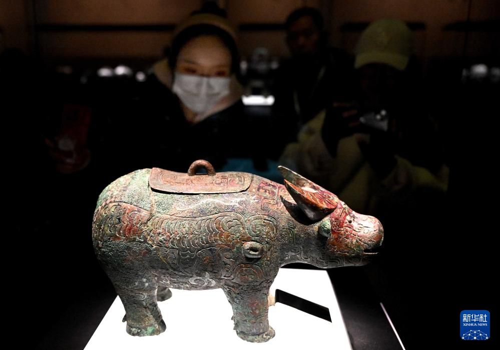 2月26日,参观者在河南安阳殷墟博物馆新馆内观看展品“亚长”牛尊。