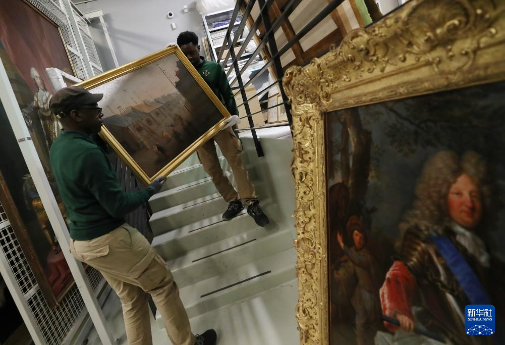3月11日,在法国巴黎近郊的凡尔赛宫,工作人员在展品打包现场忙碌。