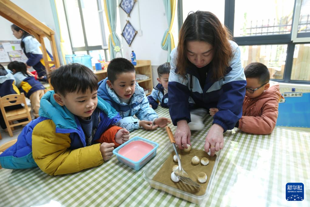 3月19日,贵州省黔南布依族苗族自治州都匀市青云湖幼儿园的老师和小朋友们一起制作汤圆“粘雀嘴”。