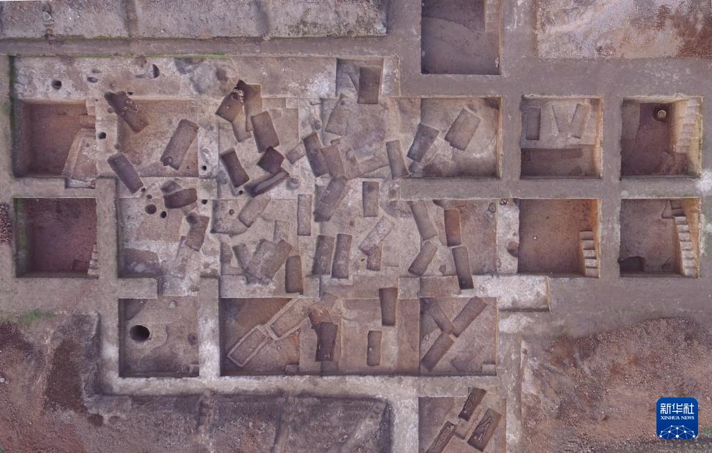 图为磨盘山遗址马家浜文化晚期房址发掘现场(2023年12月1日摄,无人机照片)。