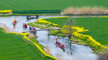 4月9日,在广西南宁市邕宁区江湾路小学,师生一起跳竹竿舞。