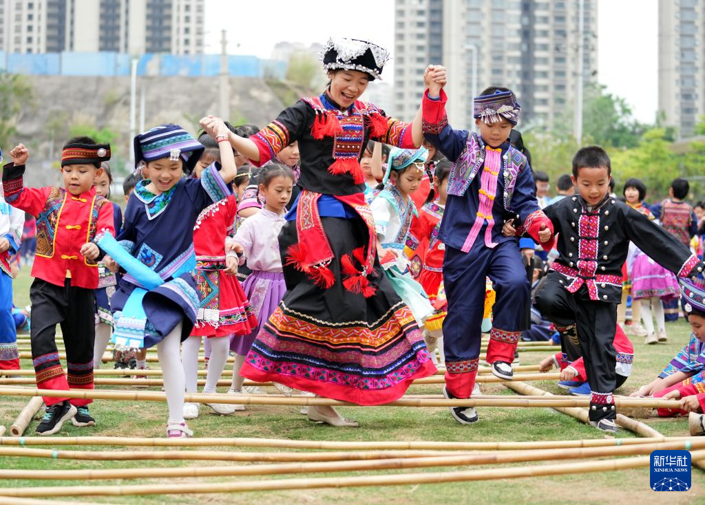 4月9日,在广西柳州市融安县实验小学,学生在跳竹竿舞。