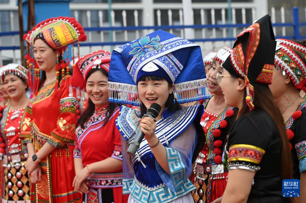 4月10日,老师和孩子们在广西南宁市逸夫小学庆祝“三月三”(无人机照片)。