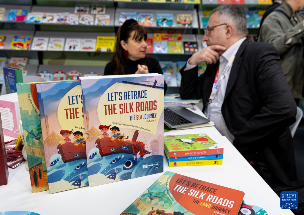 这是4月10日在意大利博洛尼亚国际儿童书展北京汇瑞时代文化集团展台拍摄的《给孩子们的丝绸之路游戏书》丛书。新华社记者 李京 摄
