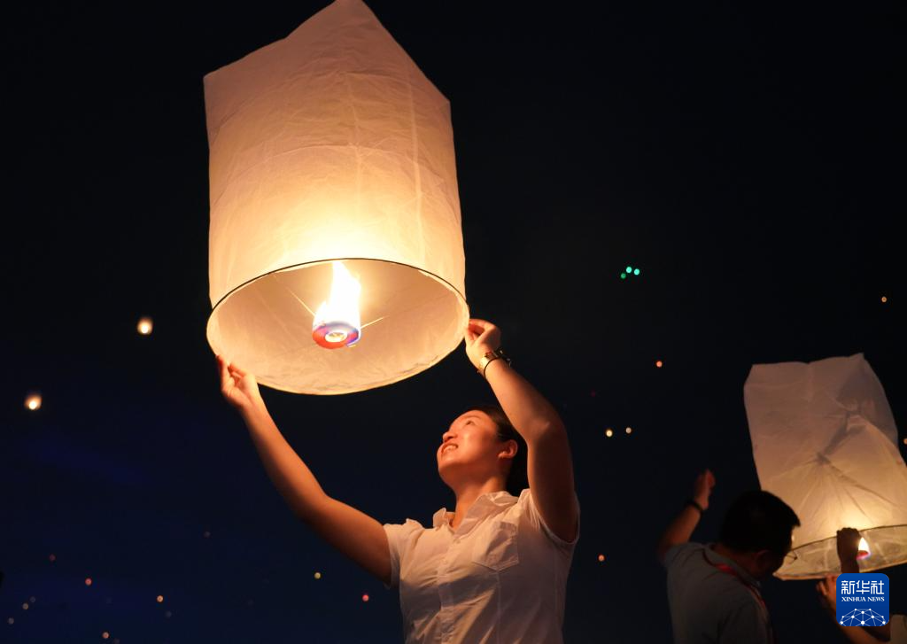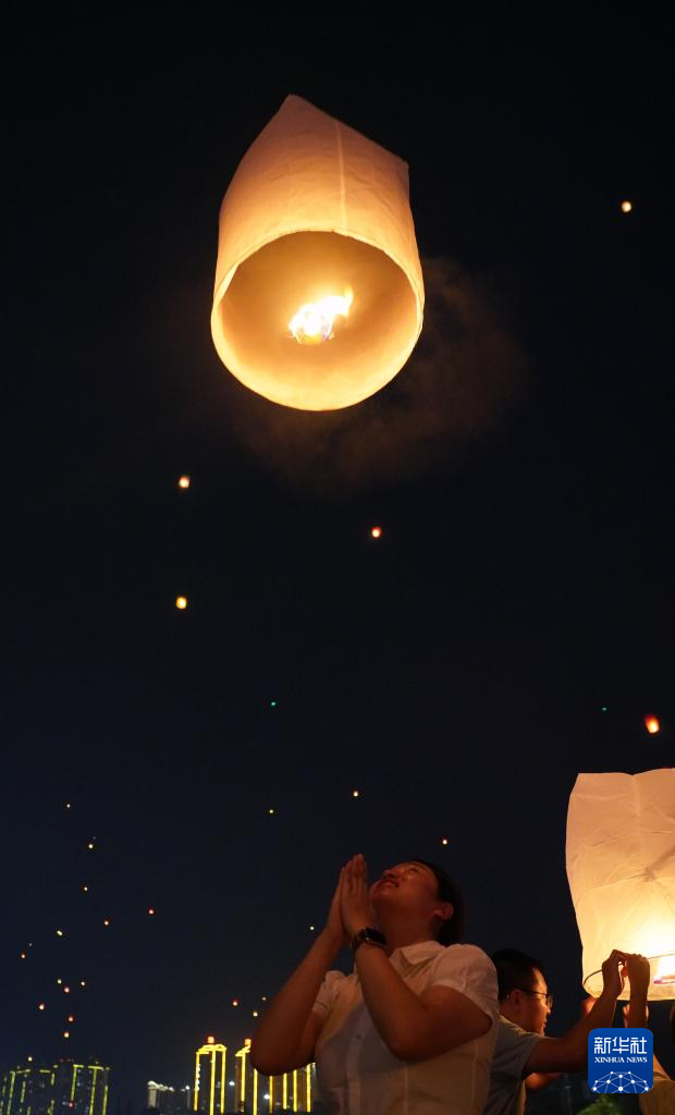 4月13日晚,在云南省西双版纳傣族自治州景洪市,人们在澜沧江边放飞孔明灯,庆祝泼水节。