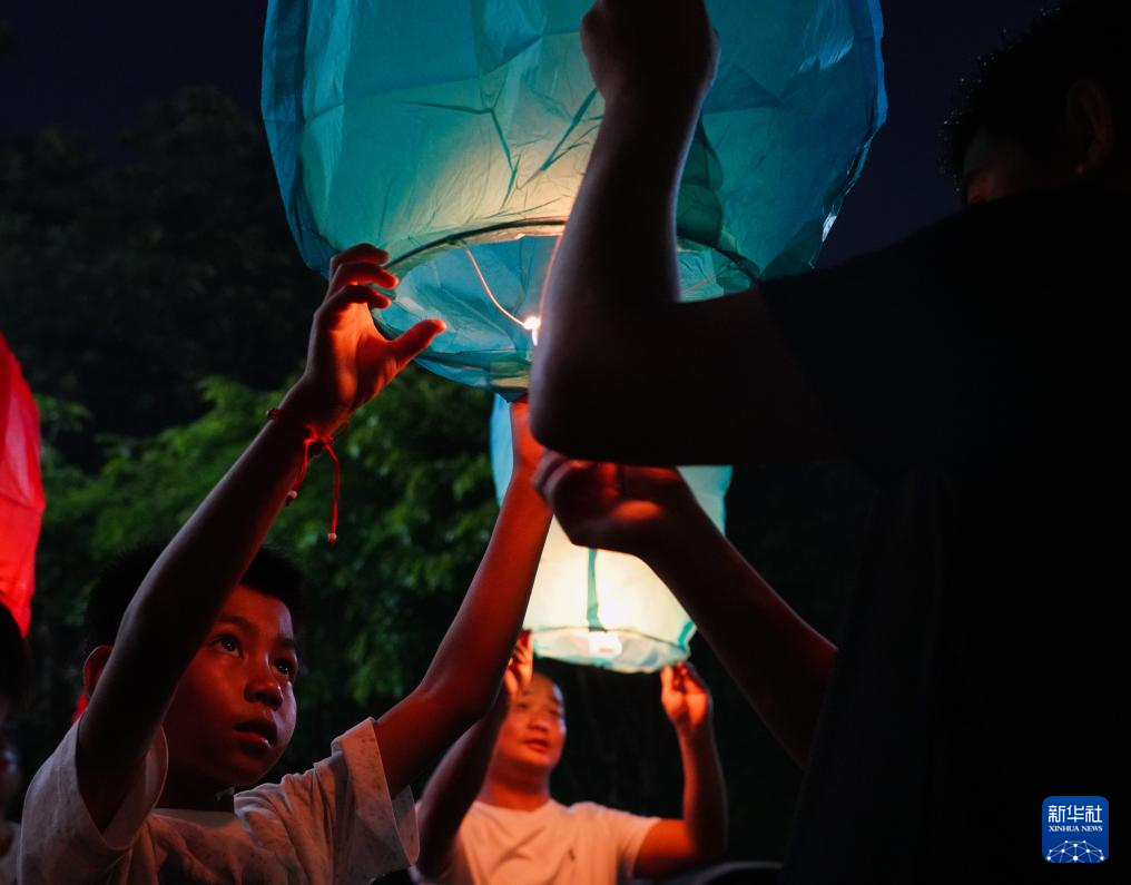 4月13日晚,人们在云南省景洪市澜沧江边放飞孔明灯。