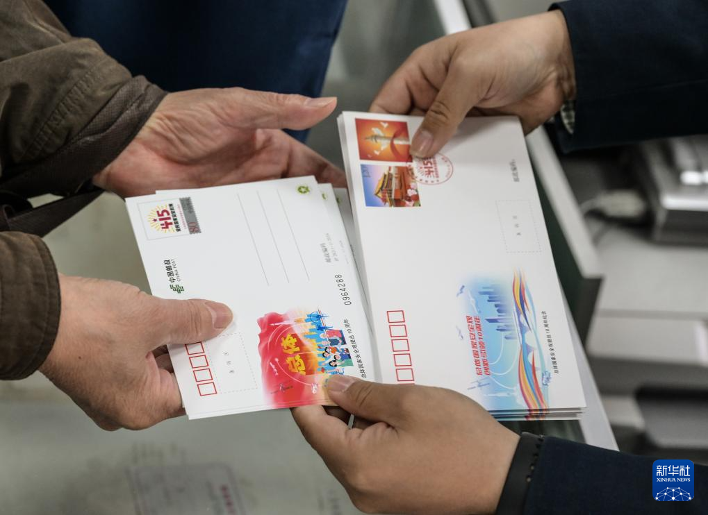 4月15日,市民在北京西城区马尾沟集邮营业厅排队购买《总体国家安全观提出10周年》相关纪念邮品。这是营业厅工作人员(右)向顾客交付其购买的邮品。