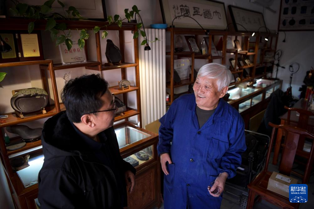闫森林(右)在工作室向顾客介绍贺兰砚(3月8日摄)。