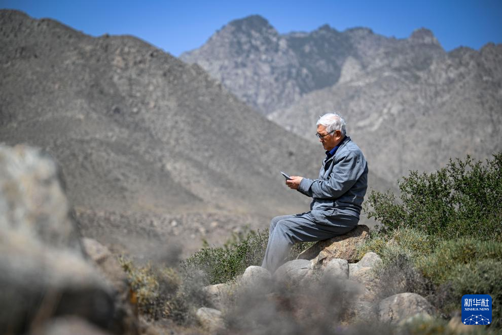 闫森林在贺兰山下品鉴贺兰石,为创作贺兰砚寻找灵感(4月15日摄)。