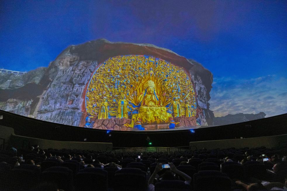 观众在大足石刻游客中心观看球幕电影。(大足石刻研究院供图)