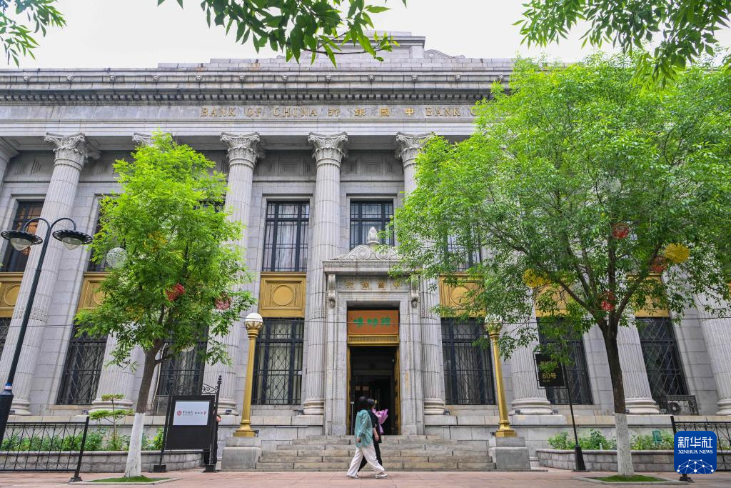 市民走过位于天津解放北路80号的中国银行博物馆(5月5日摄)。