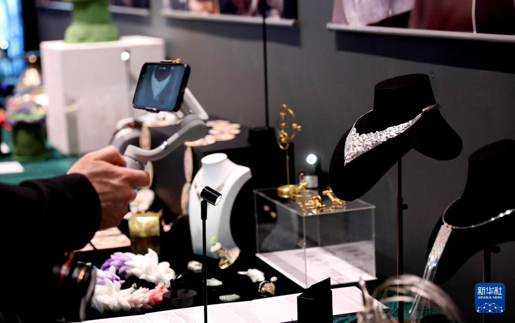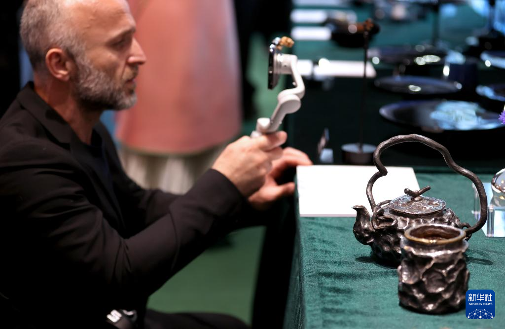 5月13日,一名观众在英国伦敦手工艺周“设计中国·和韵华夏”主题展上拍摄。