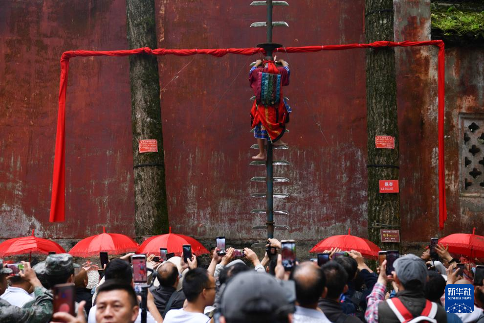 5月15日,民间艺人在贵州省黔东南苗族侗族自治州黄平县飞云崖景区“四月八”活动现场表演“上刀山”。
