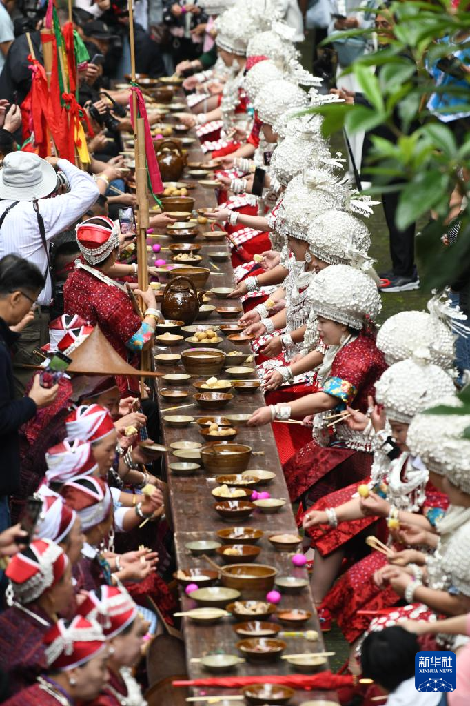5月15日,人们在贵州省黔东南苗族侗族自治州黄平县飞云崖景区体验“四月八”长桌宴。