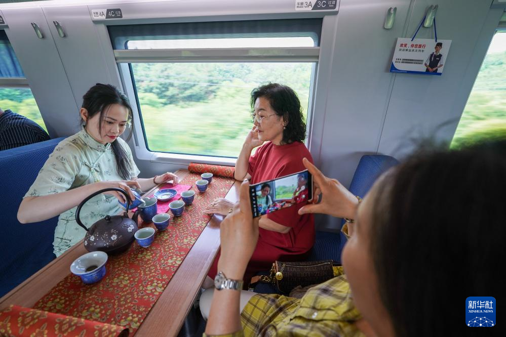 5月20日,南京客运段工作人员在G2807次高铁列车车厢内请旅客品茶。