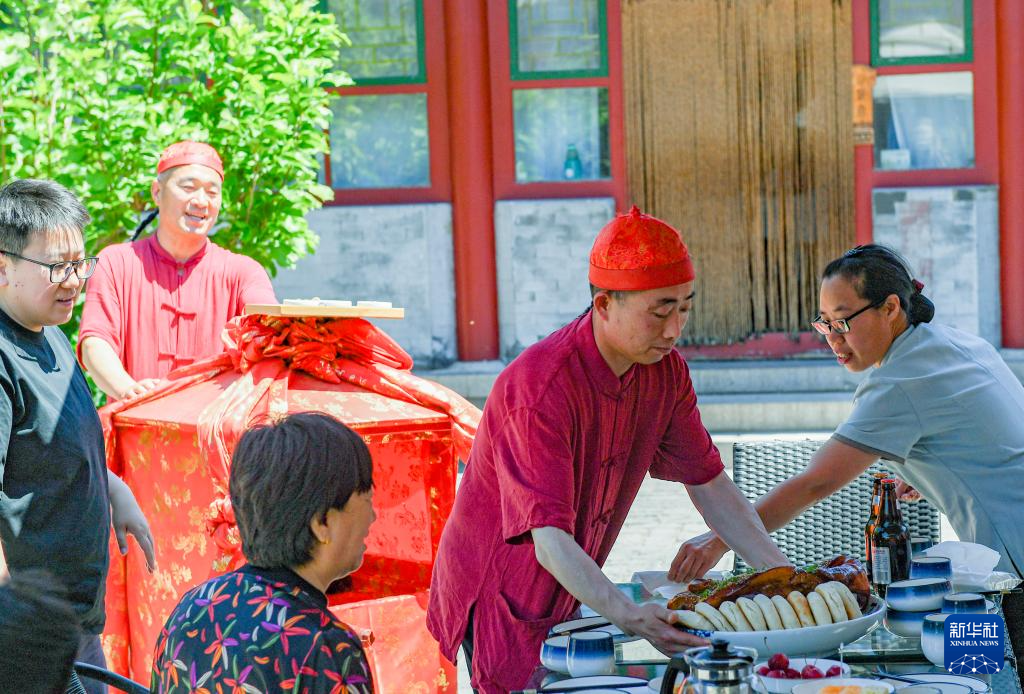 在石峡村的一家农家院餐厅,服务员为顾客呈上区级非遗美食“贺氏酱猪脸”(6月1日摄)。