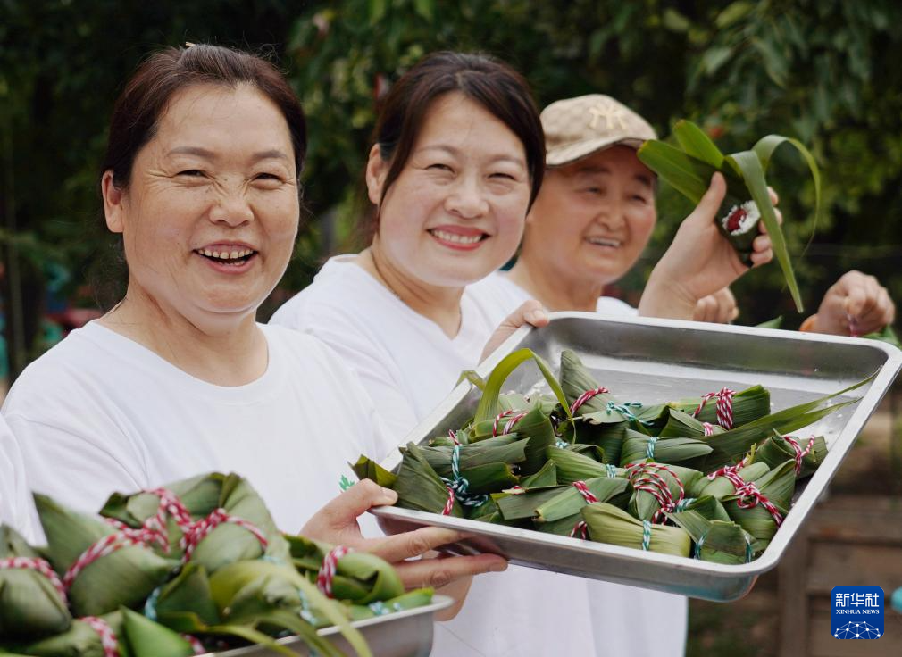 6月5日,河北省固安县马庄镇林子里村的村民展示包好的粽子。