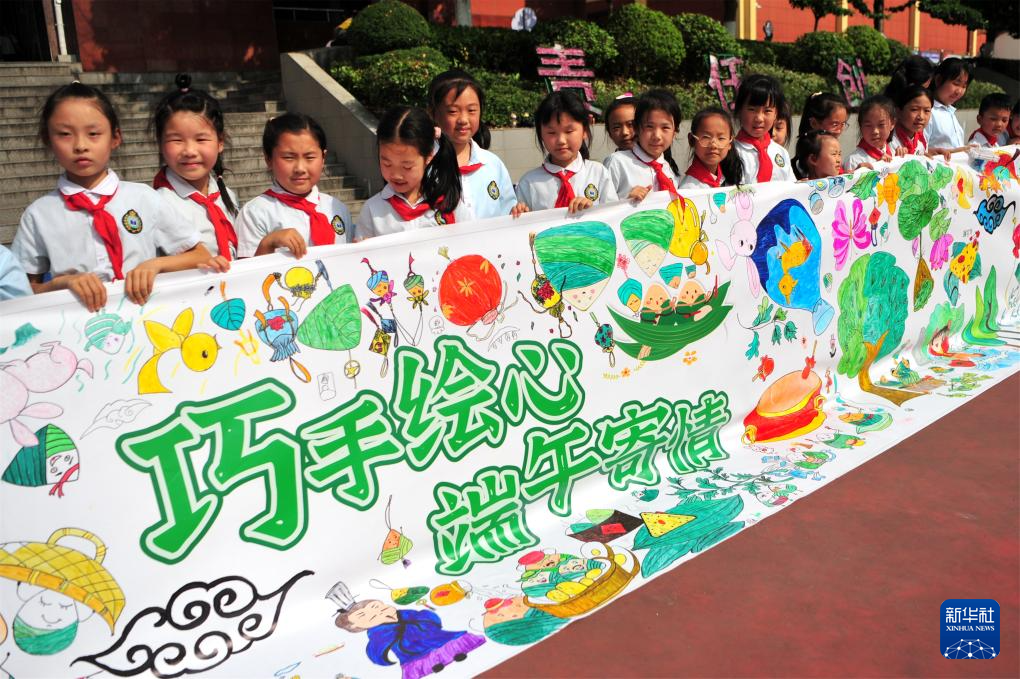 6月5日,湖北省宜昌市夷陵区实验小学的学生展示迎端午绘画作品。