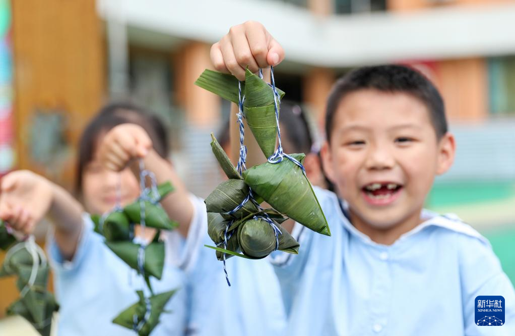 6月5日,四川省华蓥市杜家坪幼儿园的小朋友展示自己包的粽子。
