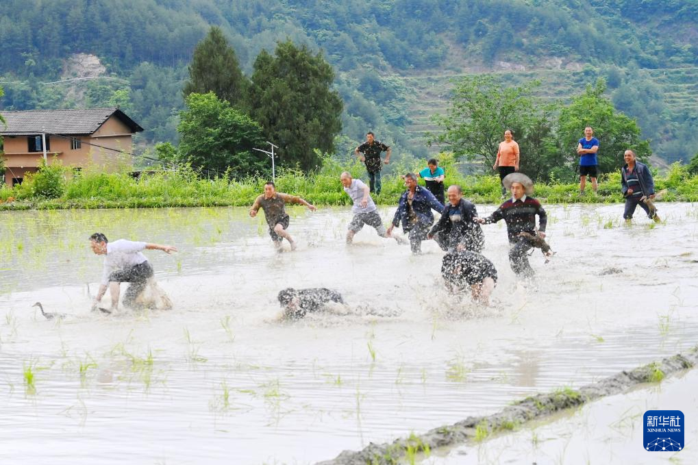 6月5日,重庆市酉阳土家族苗族自治县花田乡何家岩村的村民参加庆端午民俗活动。