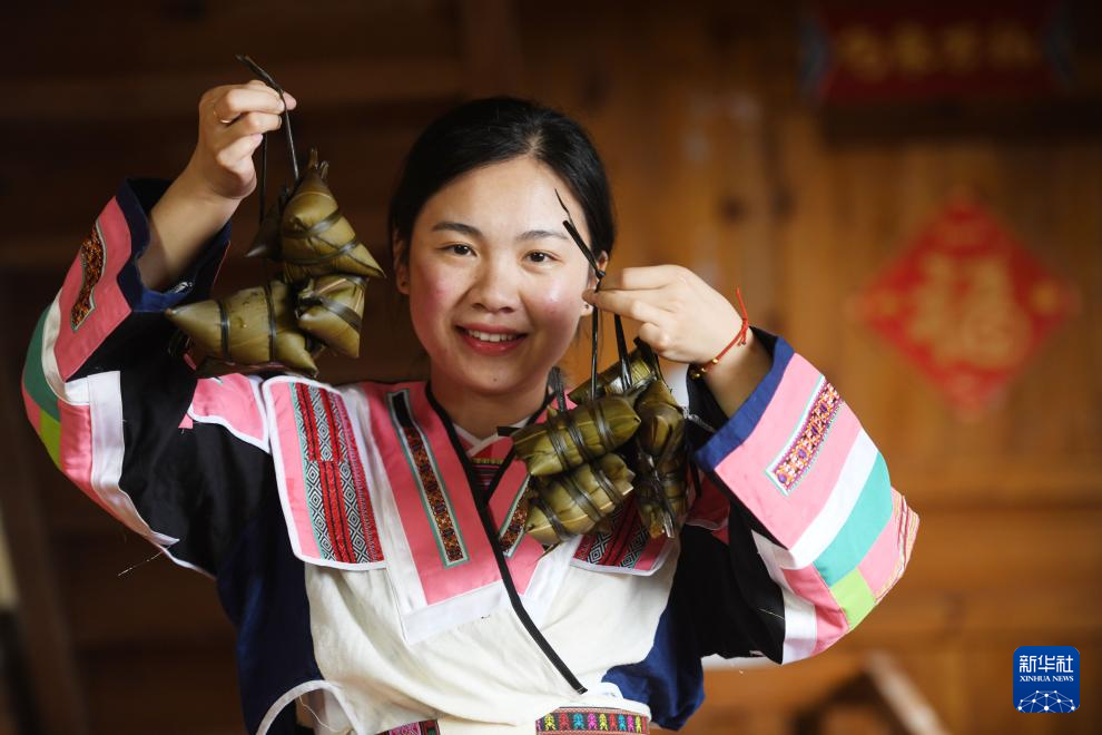 6月5日,广西桂林市龙胜各族自治县三门镇安康村的村民展示刚包好的粽子。