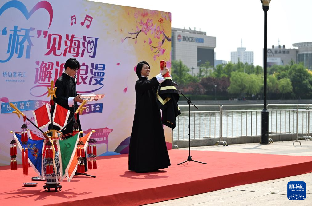 6月6日,相声演员在活动中表演节目。当日,天津市红桥区在三岔河口亲水平台举办“乐享端午”演出活动。