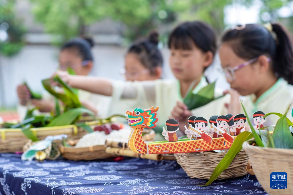 6月7日,在江苏省兴化市竹泓中心小学,学生们在体验包粽子。