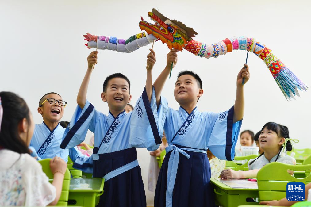 6月10日,两名学生在山东省青岛市市北区杭州路小学开展的端午文化活动上表演舞龙。