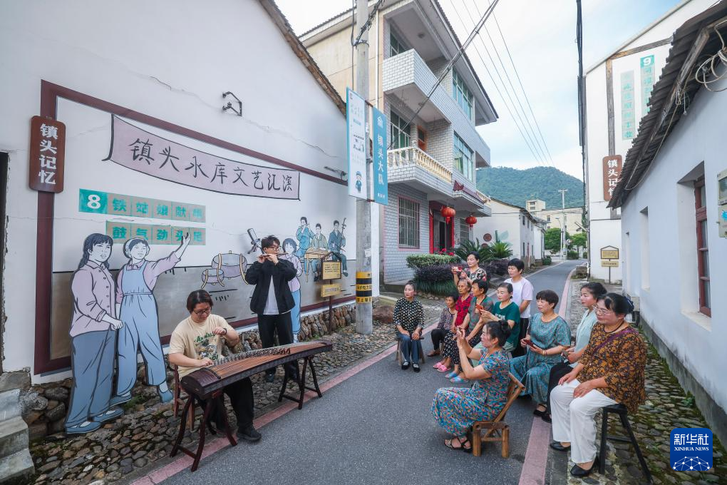 6月15日,杭州师范大学音乐学院的学生(左一、左二)在三都镇镇头村为村民即兴演出。