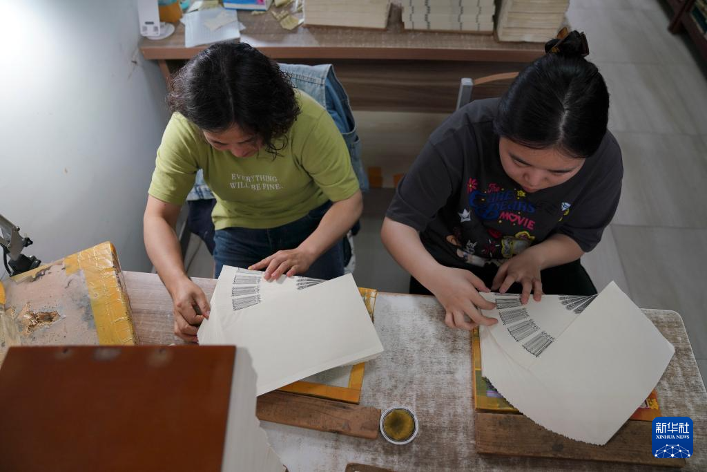 6月27日,在金陵刻经处技艺展示区,工作人员在折页。