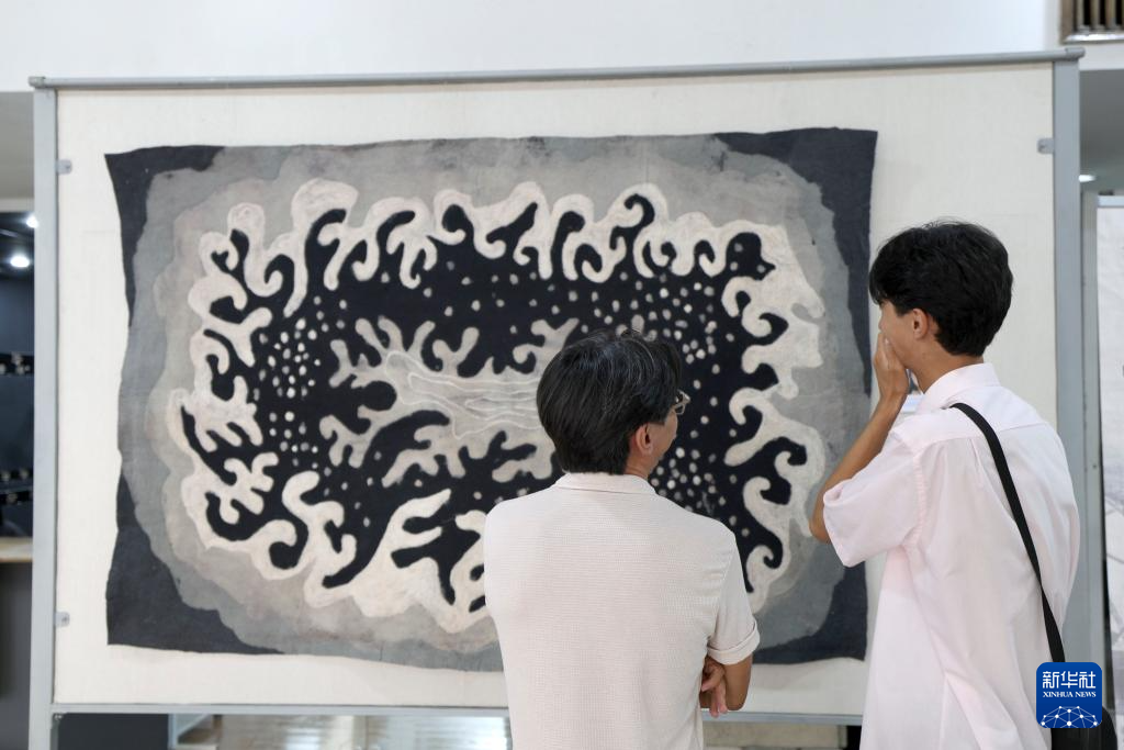 8月20日,在吉尔吉斯斯坦首都比什凯克,参观者在传统毛毡制品设计展上欣赏展品。