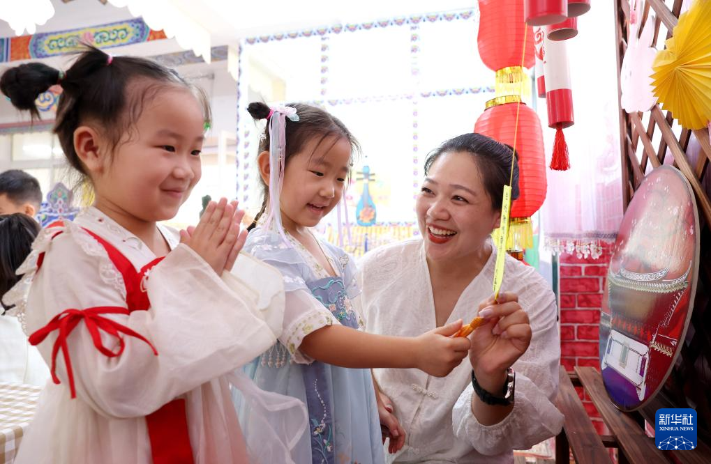 当日,河北省石家庄市藁城区通安幼儿园开展迎中秋幼儿民俗主题活动,孩子们在老师的指导下做月饼、猜灯谜,感受传统民俗的魅力。