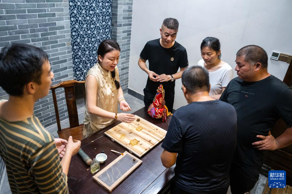 9月3日,在常德河街,传统香制作技艺非遗传承人钟玲(右一)向游客讲解熏香制作。