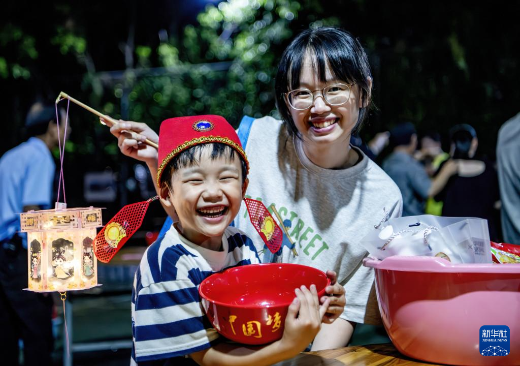 9月14日,在福建厦门一小区内,老少居民一起参加博饼活动。