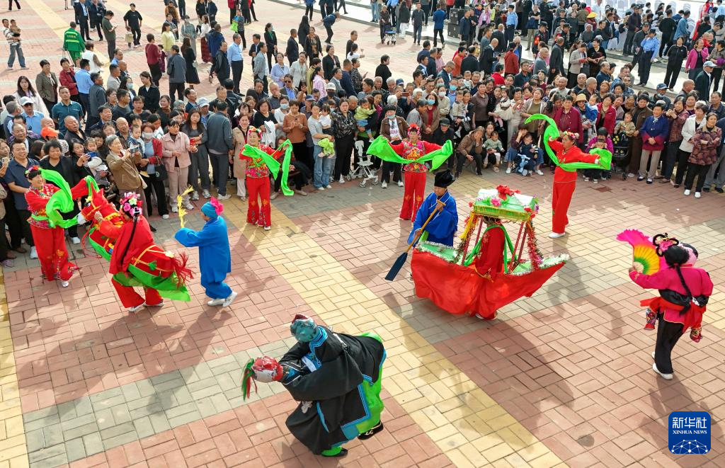 10月10日,观众在宝丰县新世纪广场观看鼓儿哼表演(无人机照片)。