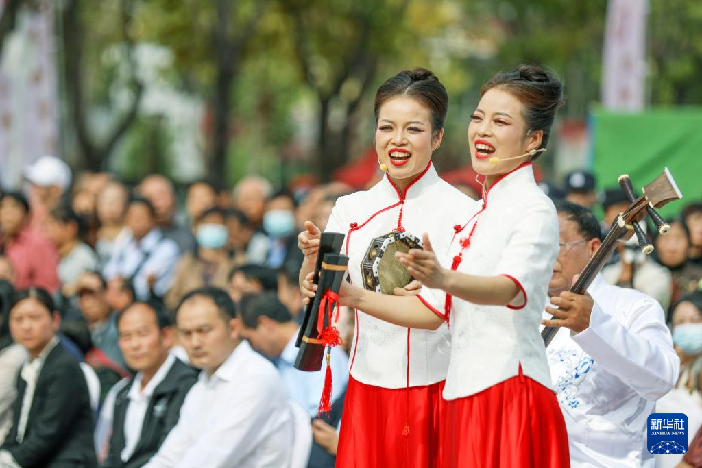 10月10日,艺人在宝丰县新世纪广场表演大调曲子。