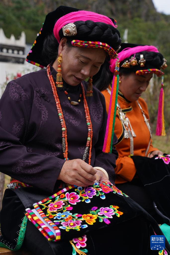 10月12日,嘉绒藏族刺绣甘孜州非遗传承人阿姆在四川省丹巴县巴底镇色足村绣花。