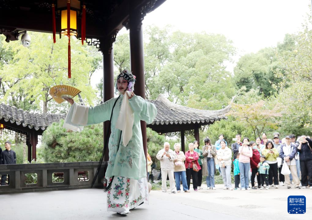 10月19日,演员在苏州虎丘山景区为游客表演昆曲。