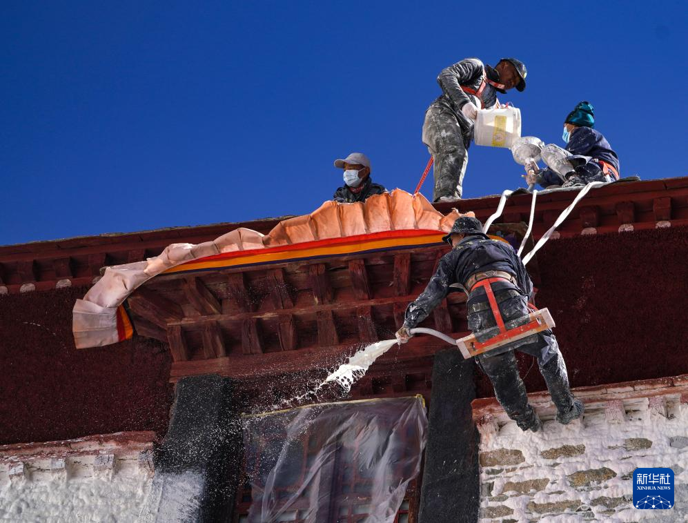 10月28日,布达拉宫管理处的工作人员在喷洒涂料。
