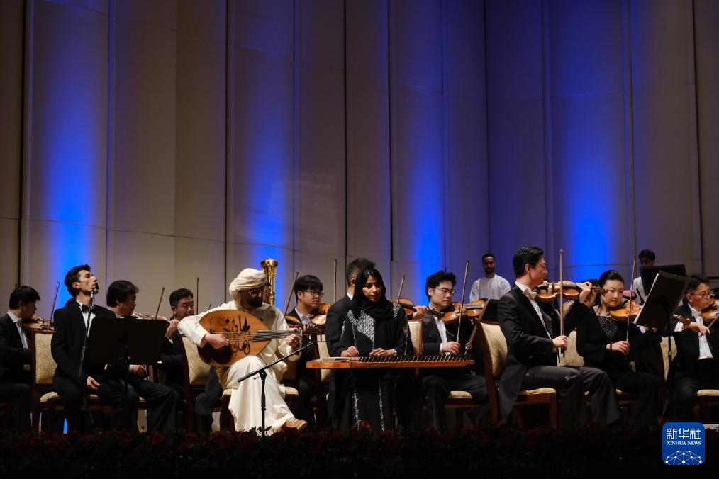 12月14日,在阿联酋首都阿布扎比的酋长国皇宫剧院,来自中国和阿联酋的乐手同台演奏曲目《亚巴赫尔》。
