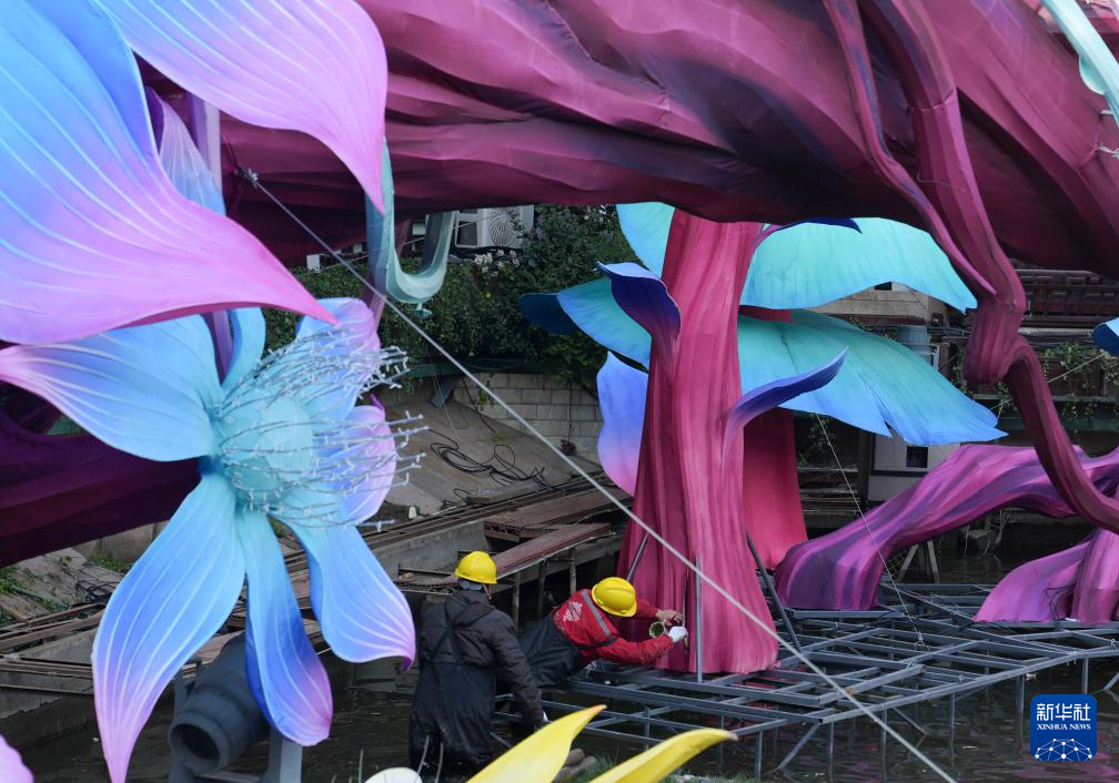 12月17日,部分用于上海豫园灯会的灯景装置被安装在豫园商城入口。