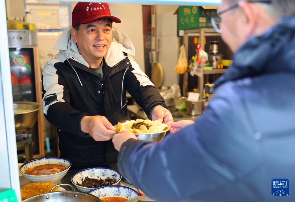 12月13日,柳州螺蛳粉制作技艺非遗传承人陈伟在自家店内为顾客端上螺蛳粉。