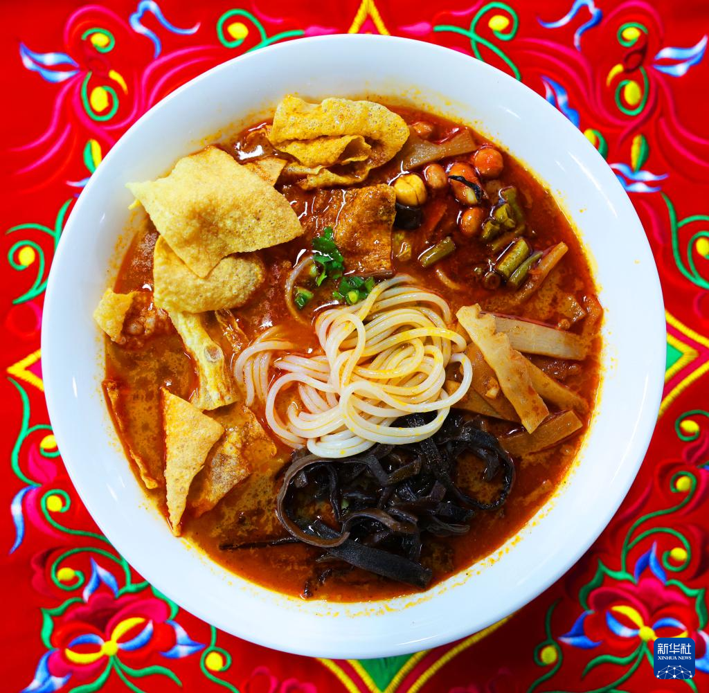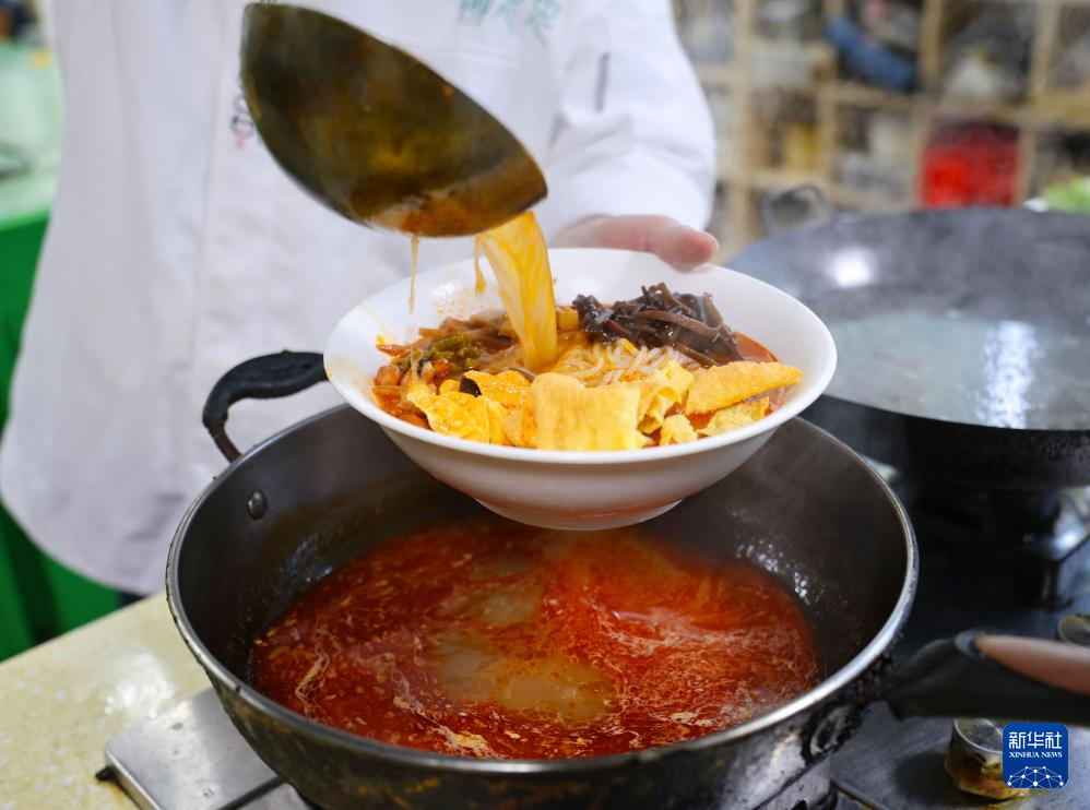这是12月12日拍摄的柳州螺蛳粉制作技艺非遗传承人黎元龙制作的螺蛳粉。