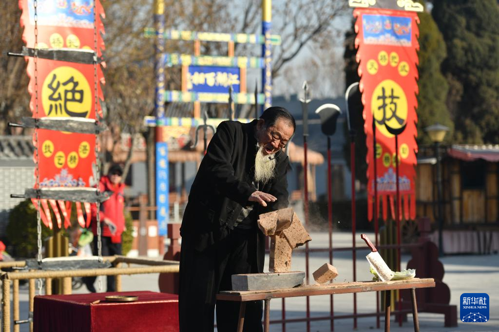 12月17日,杂技艺人在河北吴桥杂技大世界江湖文化城表演硬气功。